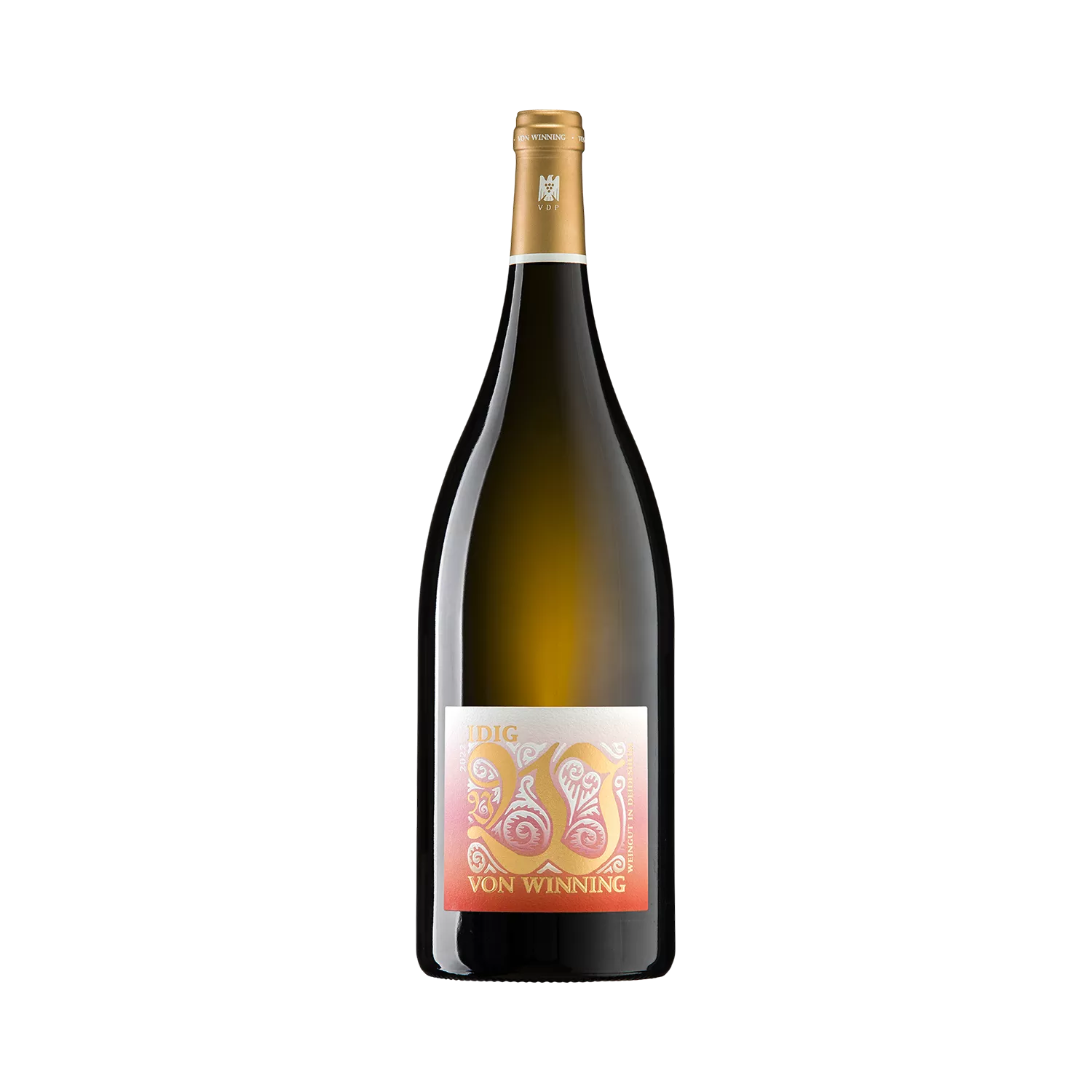 Idig GG ist die ikonische Weinbergslage von Neustadt Königsbach. Der Weinberg liegt am Hang unterhalb des Ortes, ist nach Südost ausgerichtet und wird durch Buntsandstein und viel Kalk geprägt. In der Nase präsentiert sich der Wein tiefgründig und geheimnisvoll mit Aromen von Orangenabrieb, etwas Vanille, Bergamotte, gerösteten Mandeln, Kurkuma und etwas Weihrauch. Am Gaumen ist er dann salzig, dicht und fest mit weitem Mundgefühl, feingewobener Struktur, Schmelz und saftiger Eleganz. Exotische Gewürze verbinden sich mit Orangenzeste und reifen Steinfrüchten und hallen sehr lang nach.
